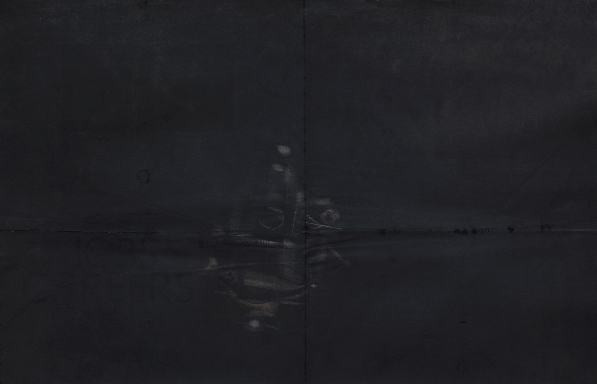 Chanruechachai’s I remember is a series of drawings on newspapers that depict light reflecting on objects in the dark. The almost pitch-black images are pictures of parts of the Apollo XI spacecraft and various other space rockets, which are floating on the wall against the gallery’s conventional white space, resembling space debris in our orbit. The renditions